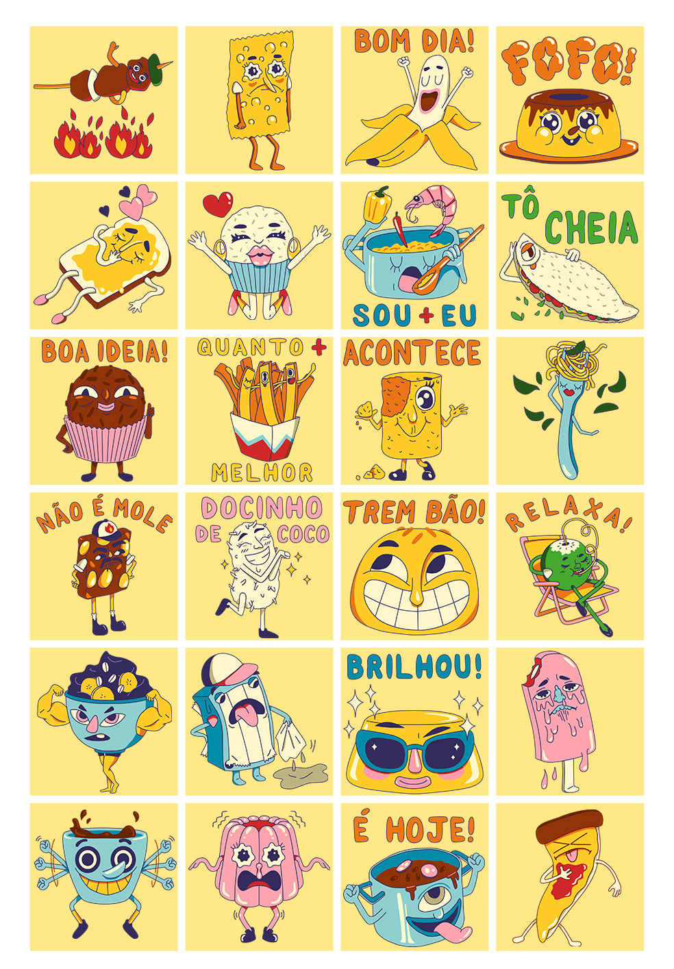 This is a set of 24 illustrated characters with the theme brazilian (emotive) snacks.